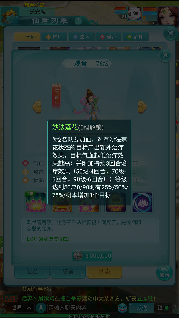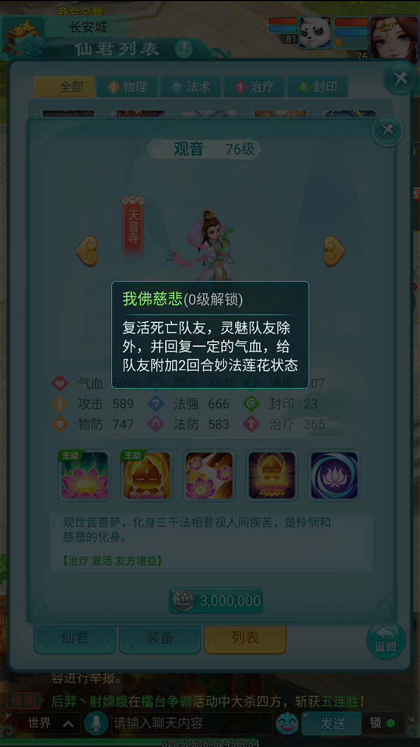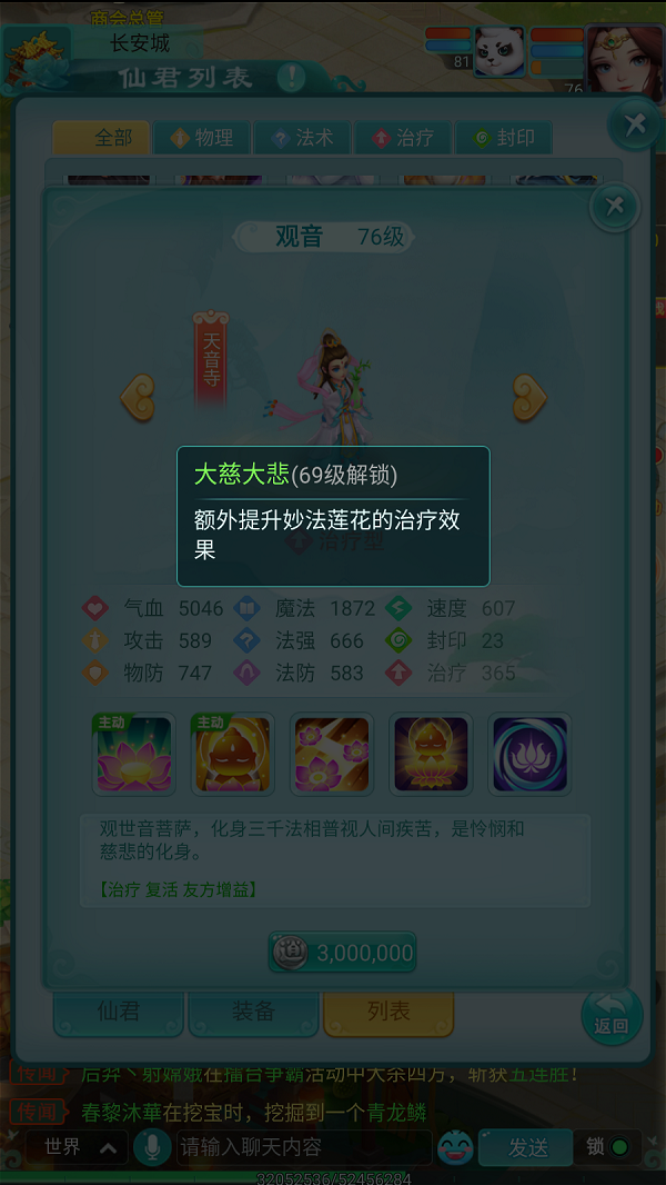 在仙君体系中,观音归属于天音寺这一治疗专精门派。她不仅自身拥有卓越的生存能力,更具备强大的团队治疗与复活技能,堪称最专业的"奶**"。有她在阵中,整个队伍的生存能力都将获得质的飞跃。